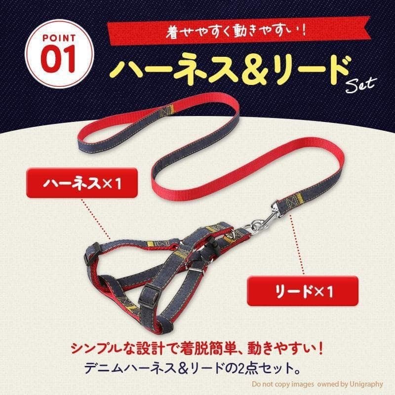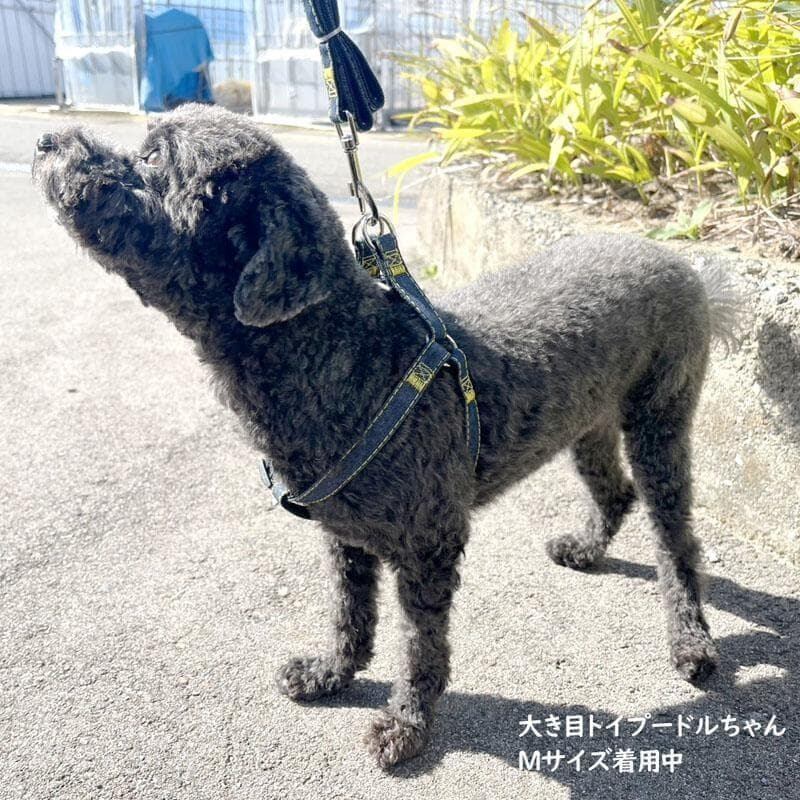 デニムデザインのMサイズハーネスとリードセット、調整可能なベルト付き。