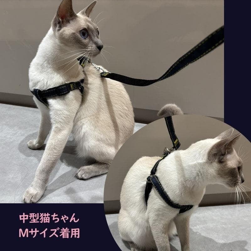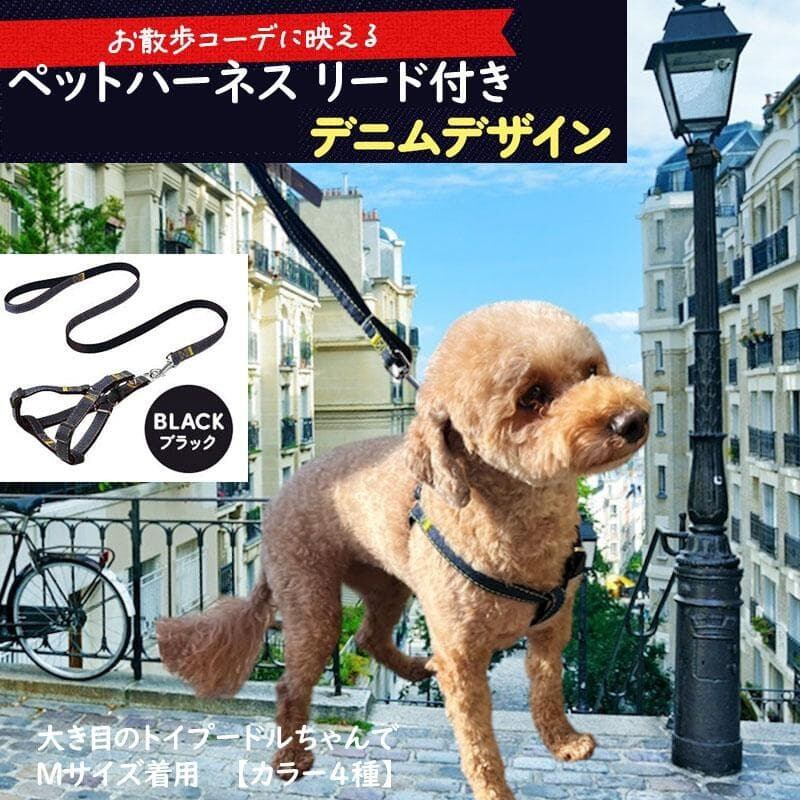 犬ハーネス 猫 デニム リード付き 散歩 簡単装着 おしゃれ 胴輪 M ブラック