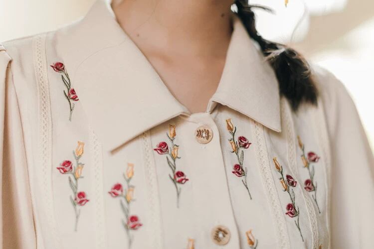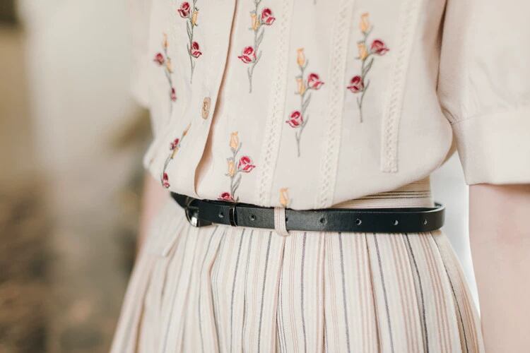トップスは華奢なパフスリーブと、小花柄の刺繍が特徴。