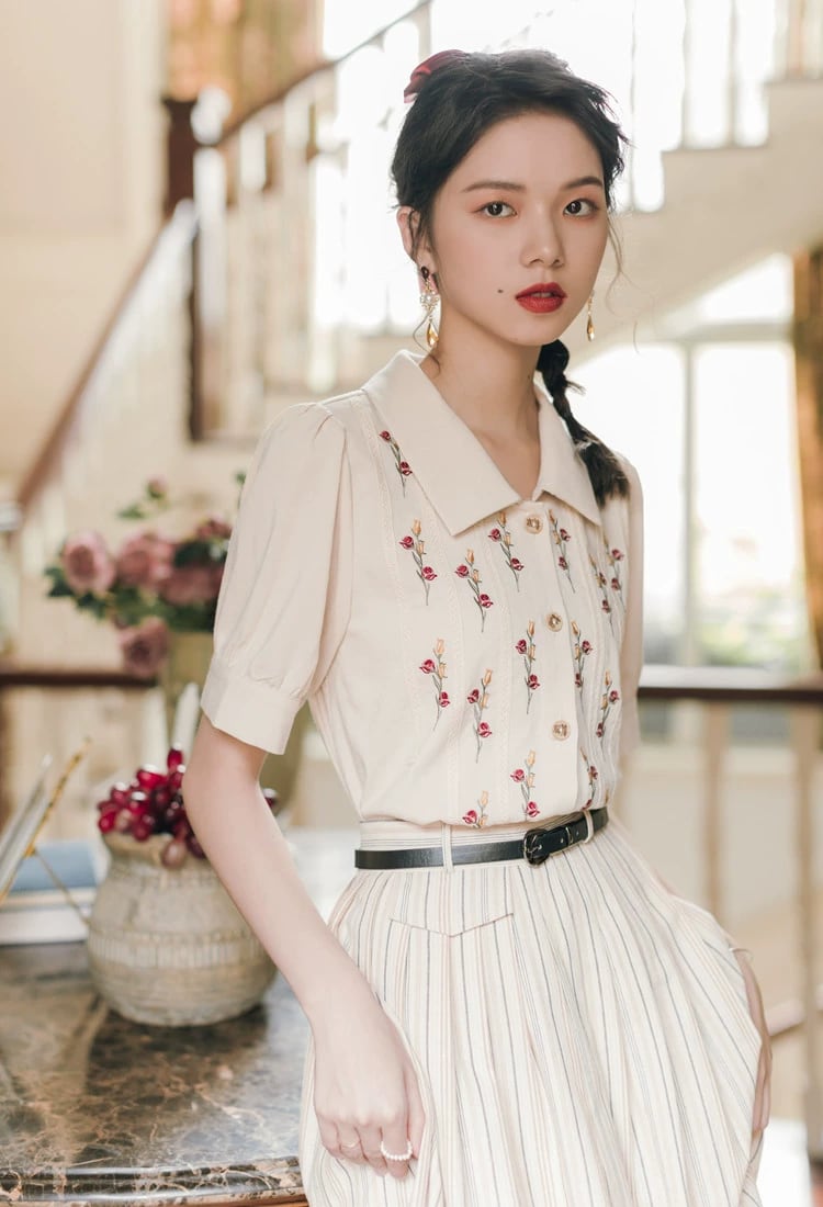 トップス スカート セットアップ ブラウス ロングスカート ミドル丈 パフスリーブ 襟付き Aライン 刺繍 2点セット かわいい きれいめ 上品 レトロ ラブリー キュート ガーリー 柔らか ふんわり 軽やか ほんわか 甘い 小花柄 ストライプ 春 夏 10代 20代 デート お出かけ 女子会 パーティー ホテル レストラン ショッピング カフェ ファッション コーデ スタイル サイズ S M L XL ベージュ