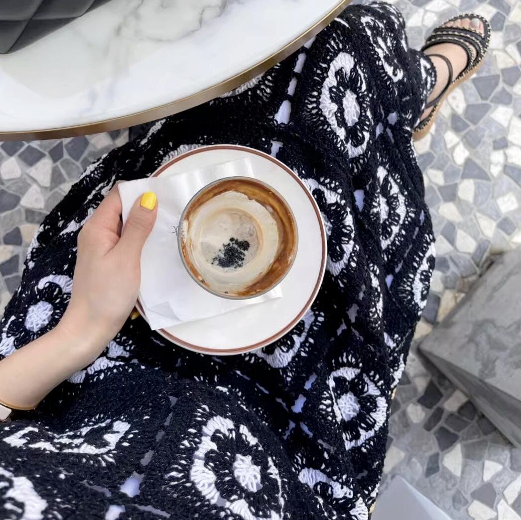 ロング丈のTシャツとストレートなIラインのクロシェ編み込みスカートが上下セットになっており、お得感も◎。