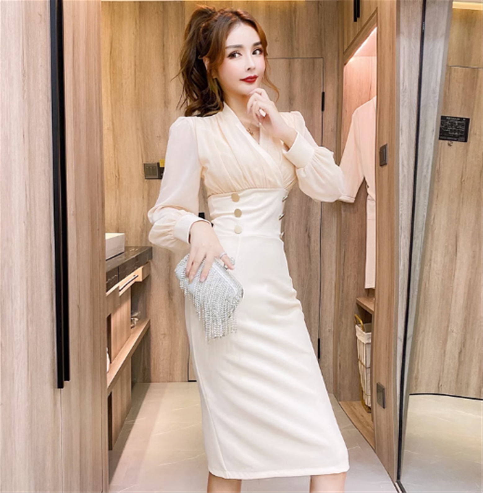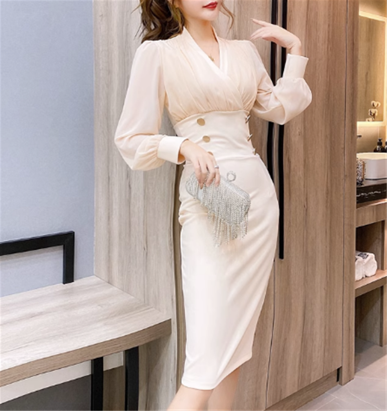 ワンピース タイト ひざ丈 袖あり 長袖 Vネック 襟なし スリム 細身 カシュクール バックスリット ハイウエスト 透け感 大人可愛い きれいめ シンプル 上品 お洒落 大人女子 こなれ感 シック 個性的 エレガント 主役級 存在感 無地 春 秋 10代 20代 30代 40代 レディース ママ 学生 通学 デート 女子会 休日 イベント フォーマル 通勤 オフィス ホテル ガーデン レストラン ショッピング 普段使い モテ インスタ映え 脚長 定番 S M L XL ホワイト ブラック