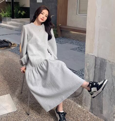 ワンピース Aラインワンピース ロング丈 袖あり 長袖 ボリューム袖 ラウンドネック フリル 厚手 大人可愛い きれいめ シンプル カジュアル 大人 上品 おしゃれ 大人女子 こなれ感 ガーリー 主役級 存在感 ラフ 春 秋 冬 10代 20代 30代 40代 レディース ママ 学生 通学 デート お出かけ 休日 ショッピング リゾート 海 着回し お揃い 双子 普段使い 重ね着 体型カバー 定番 ゆる ゆったり 楽ちん 韓国 オルチャン コーデ モテ インスタ映え S M L グレー