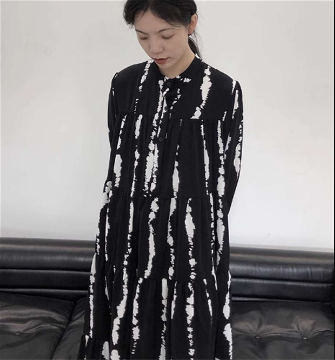シンプルなデザインながら、前開きのスタイルやフレアのティアードデザインがおしゃれで存在感のある一着です。