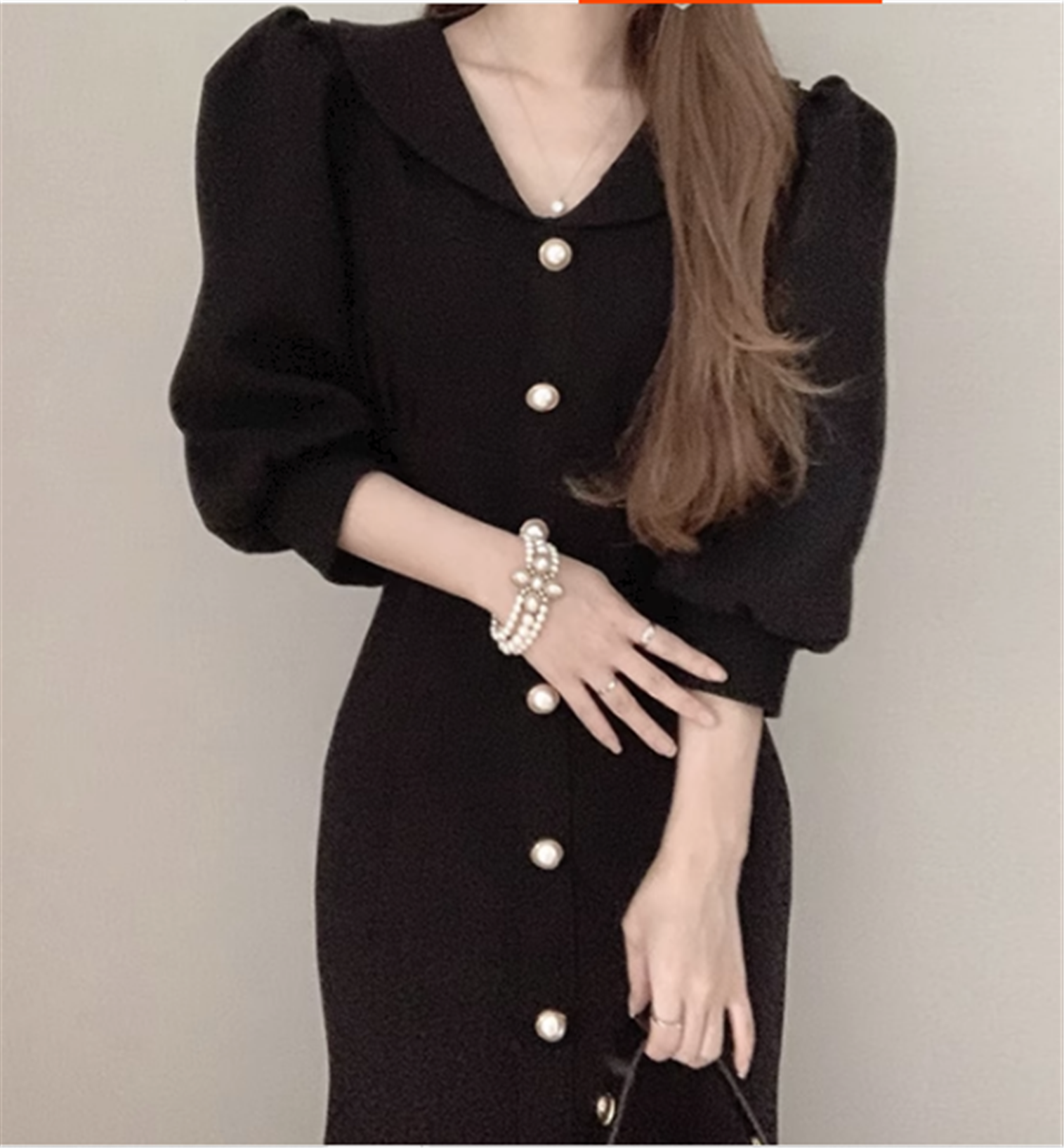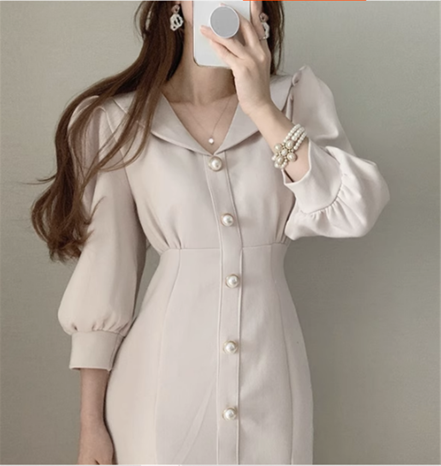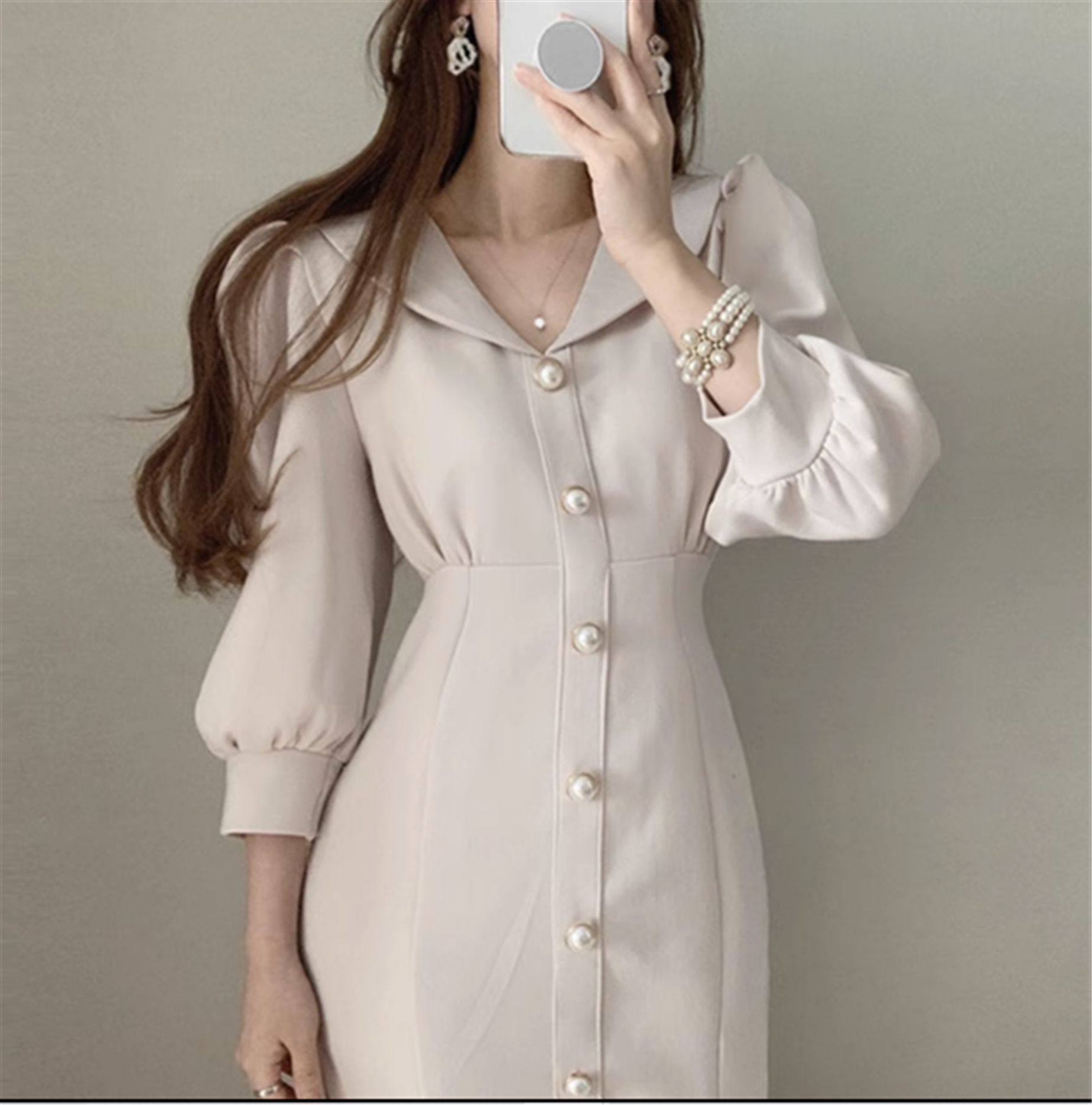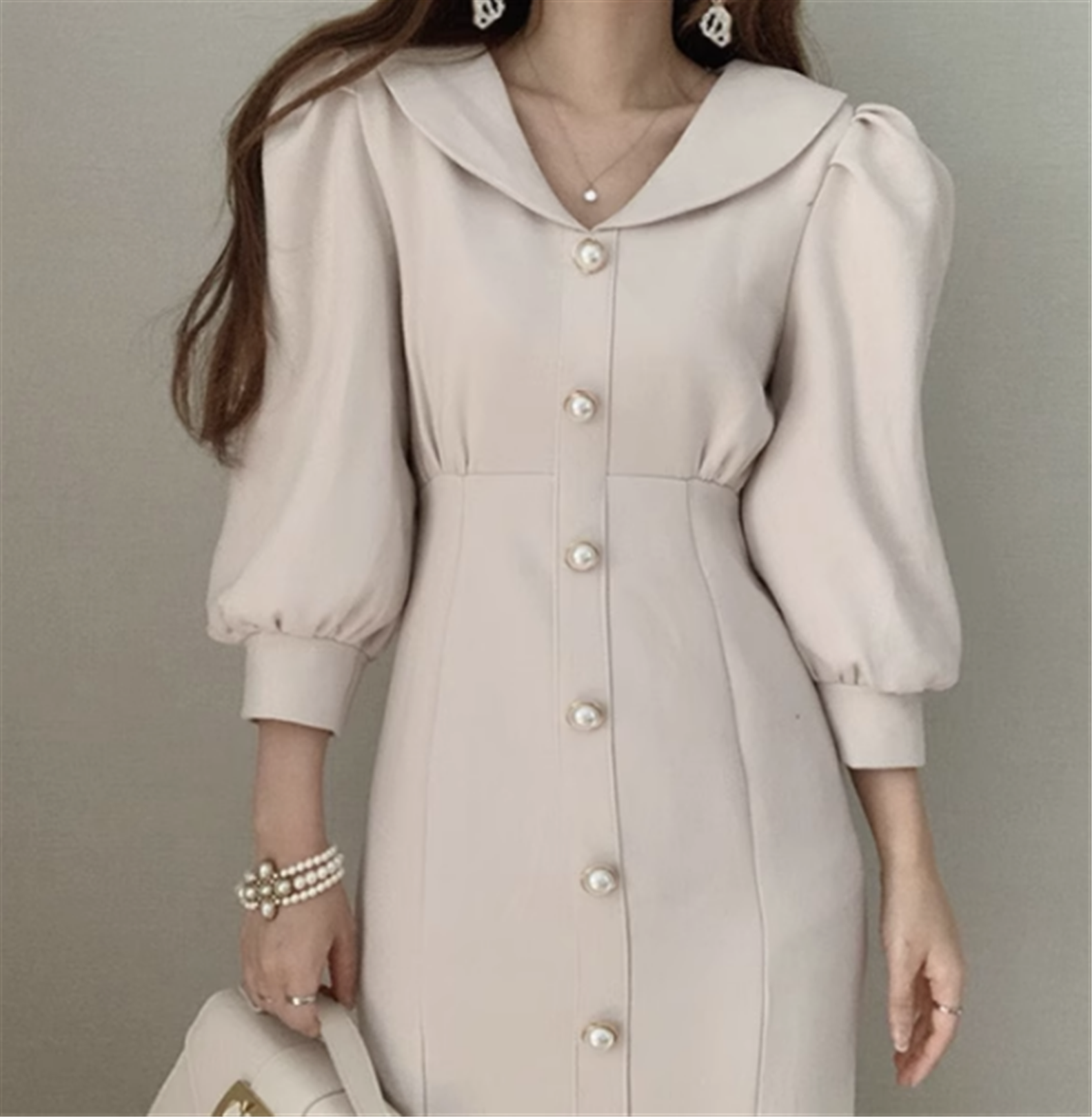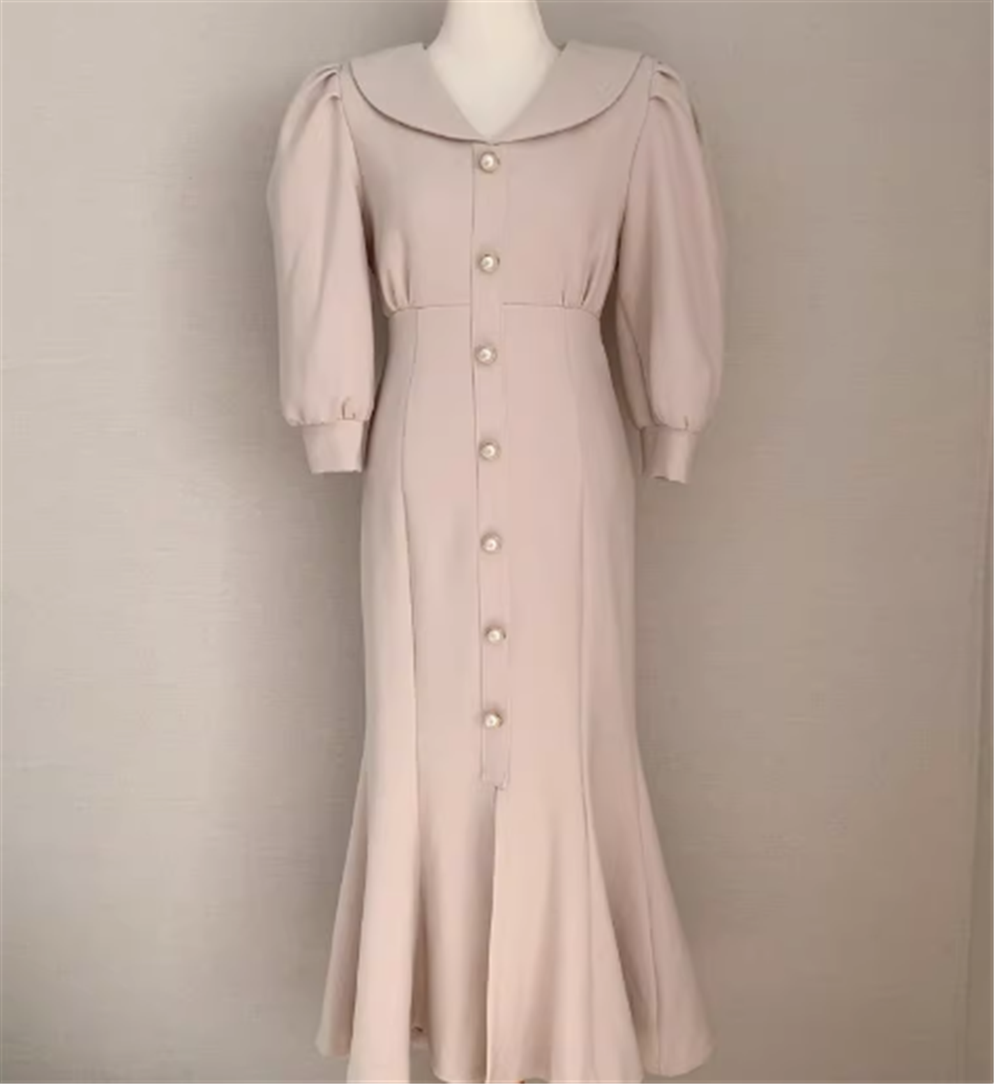 ワンピース マーメイドワンピース セミフレア ロング丈 袖あり 9分袖 パフスリーブ Vネック 襟あり パールボタン ハイウエスト 大人可愛い きれいめ シンプル カジュアル 大人 上品 おしゃれ 大人女子 こなれ感 主役級 存在感 無地 春 夏 秋 10代 20代 30代 40代 レディース 学生 通学 デート お出かけ 女子会 休日 パーティ イベント 旅行 ホテル ガーデン レストラン ショッピング 韓国 オルチャン コーデ モテ 脚長 インスタ映え S M L アプリコット ブラック