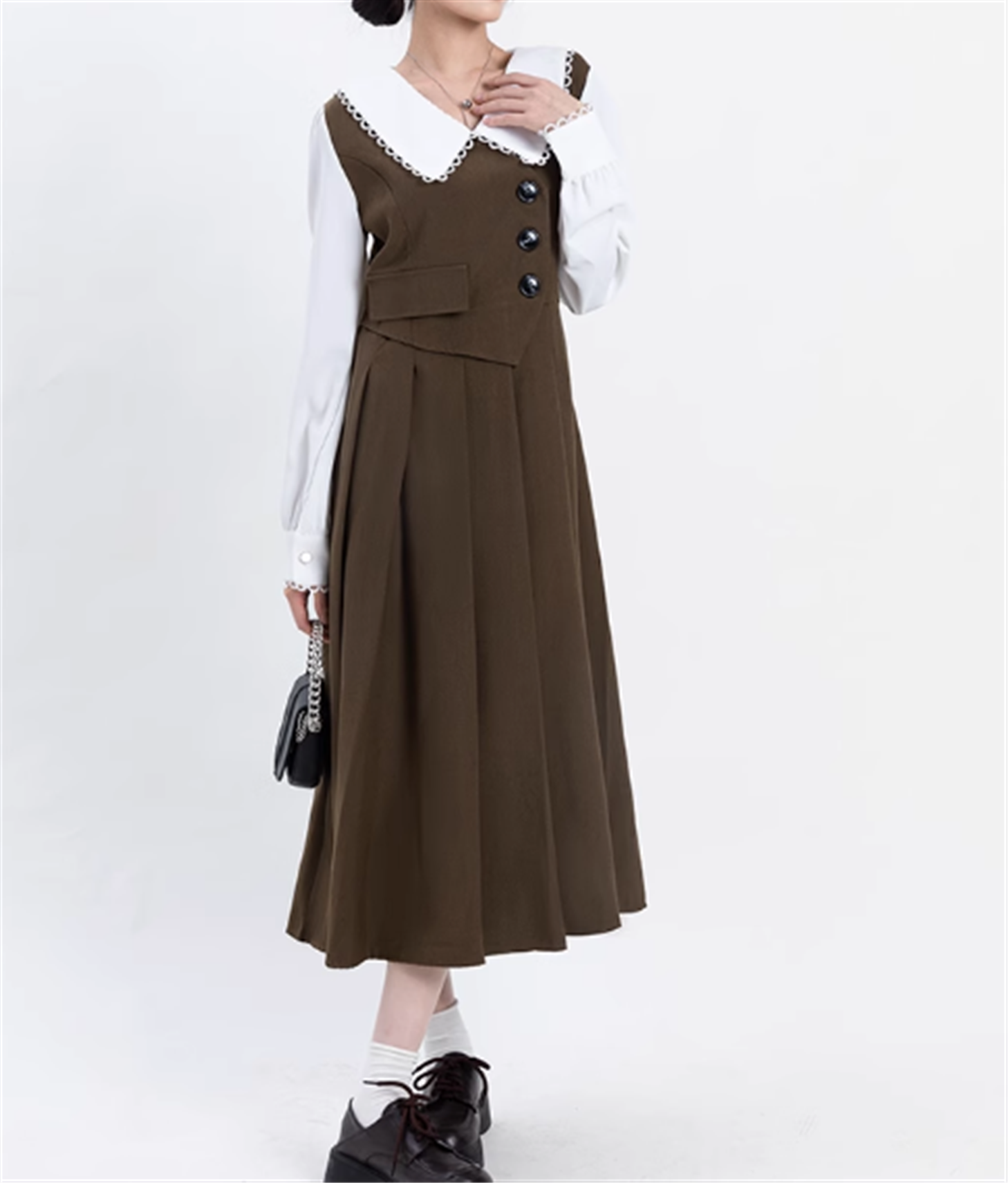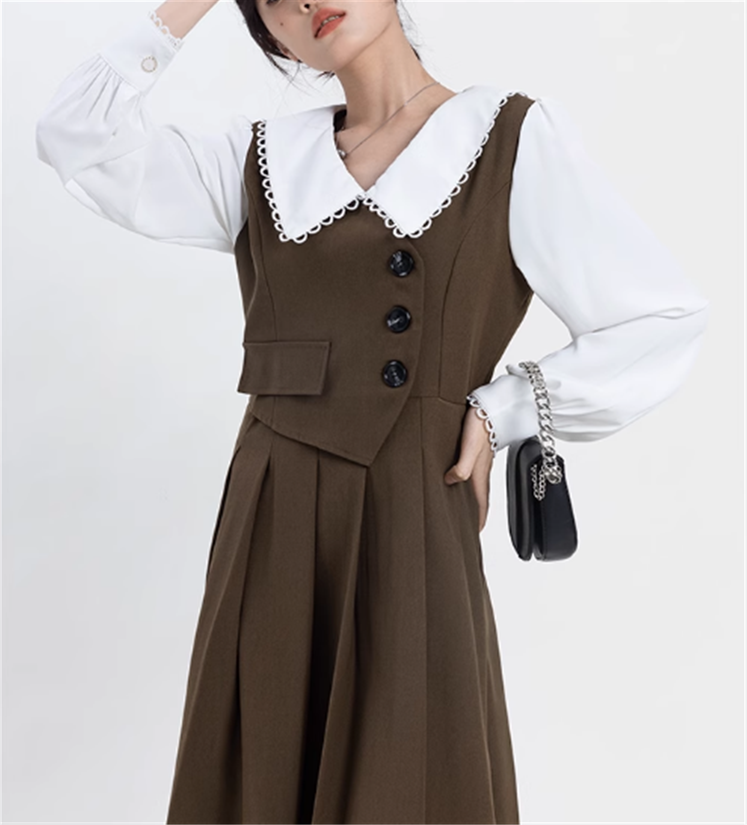 プリーツのディテールが施された袖ありデザインは、フェミニンさを引き立てます。
