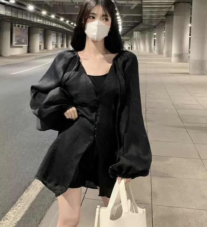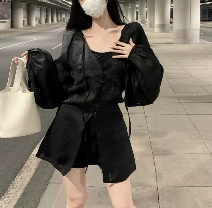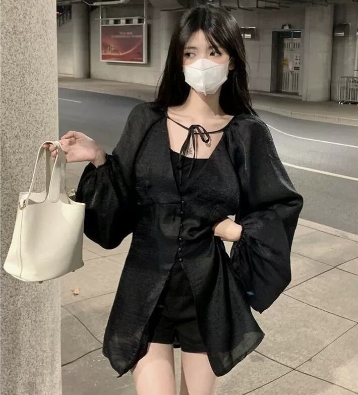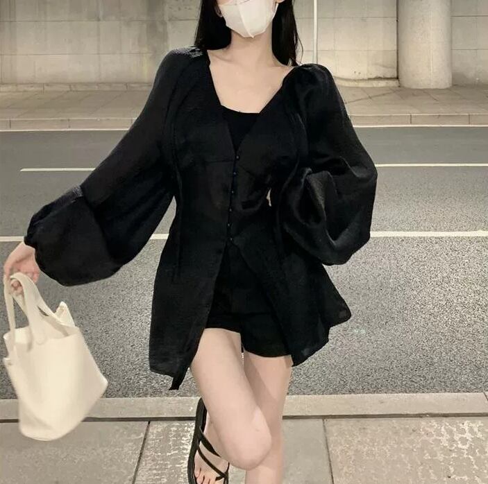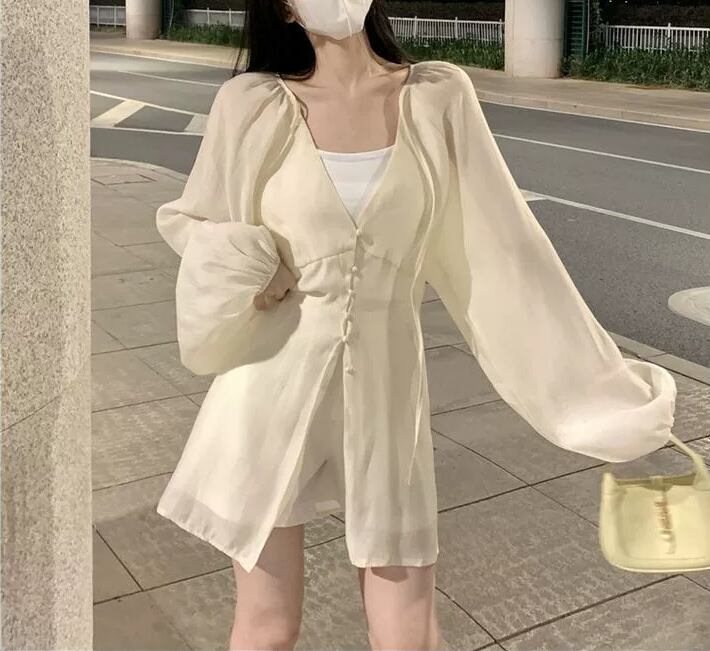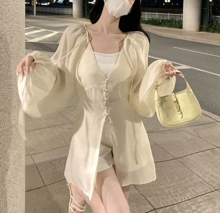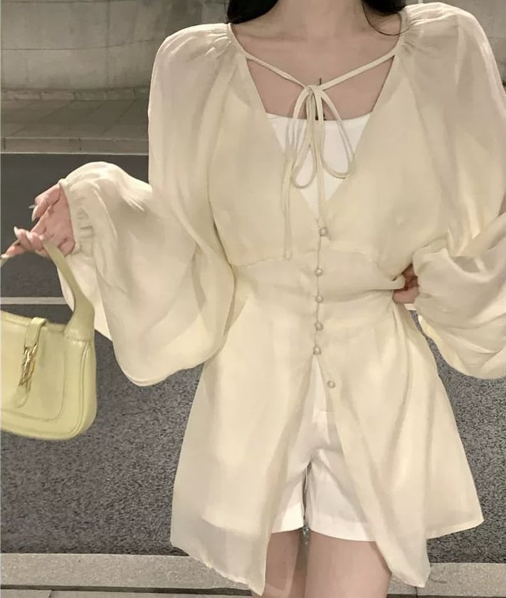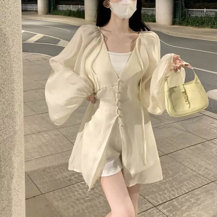 トップス シャツジャケット フランス風 Vネック ストラップ シフォン 長袖 フェアリー 紐 夏 ボタン バルーンスリーブ 無地 スリムフィット ミドル丈 羽織物 シック カジュアル 足長効果 シングルブレスト サマ見え こなれ感 大人カッコイイ 大人っぽい シンプル 細見え おしゃれ スッキリ見え モテコーデ 通勤 通学 学生 OL ルーズ 体型カバー10代 20代 30代 レディース お出かけ 休日 人気 好印象 お買い物 便利 使いやすい 韓国 ワンサイズ アプリコット コーヒー ブラック