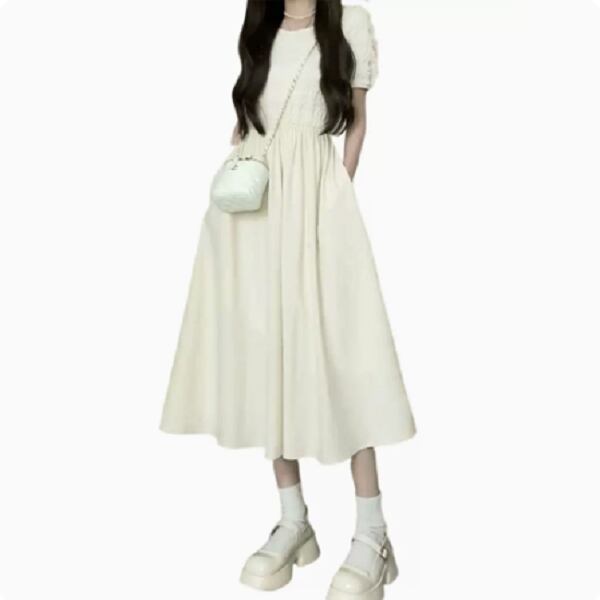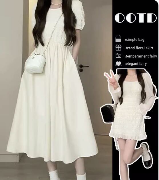 ラウンドネックとパフスリーブが女性らしさを引き立て、ロングスカートとショートスカートの2WAYで着回しも楽しめます。