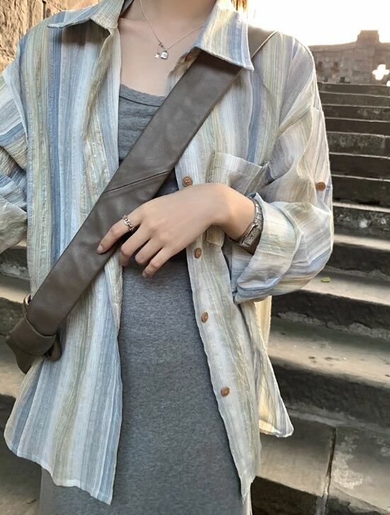 トップス シャツ フレンチ ストライプシャツ ポロカラー コットン 薄い 日焼け止め ジャケット ゆったり 羽織物 シャツスリーブ 長袖 ボタン シングルブレスト 春秋冬 新作 ルーズフィット 好印象 メンズライク きれいめ レディース 大人っぽい 通勤 通学 OL 学生 10代 20代 モテコーデ おしゃれ 細見え サマ見え こなれ感 足長見え 華奢見え ヤセ見え スマート スッキリ見え リゾート 旅行 スタイルUP S M L XL 2XL ブルー