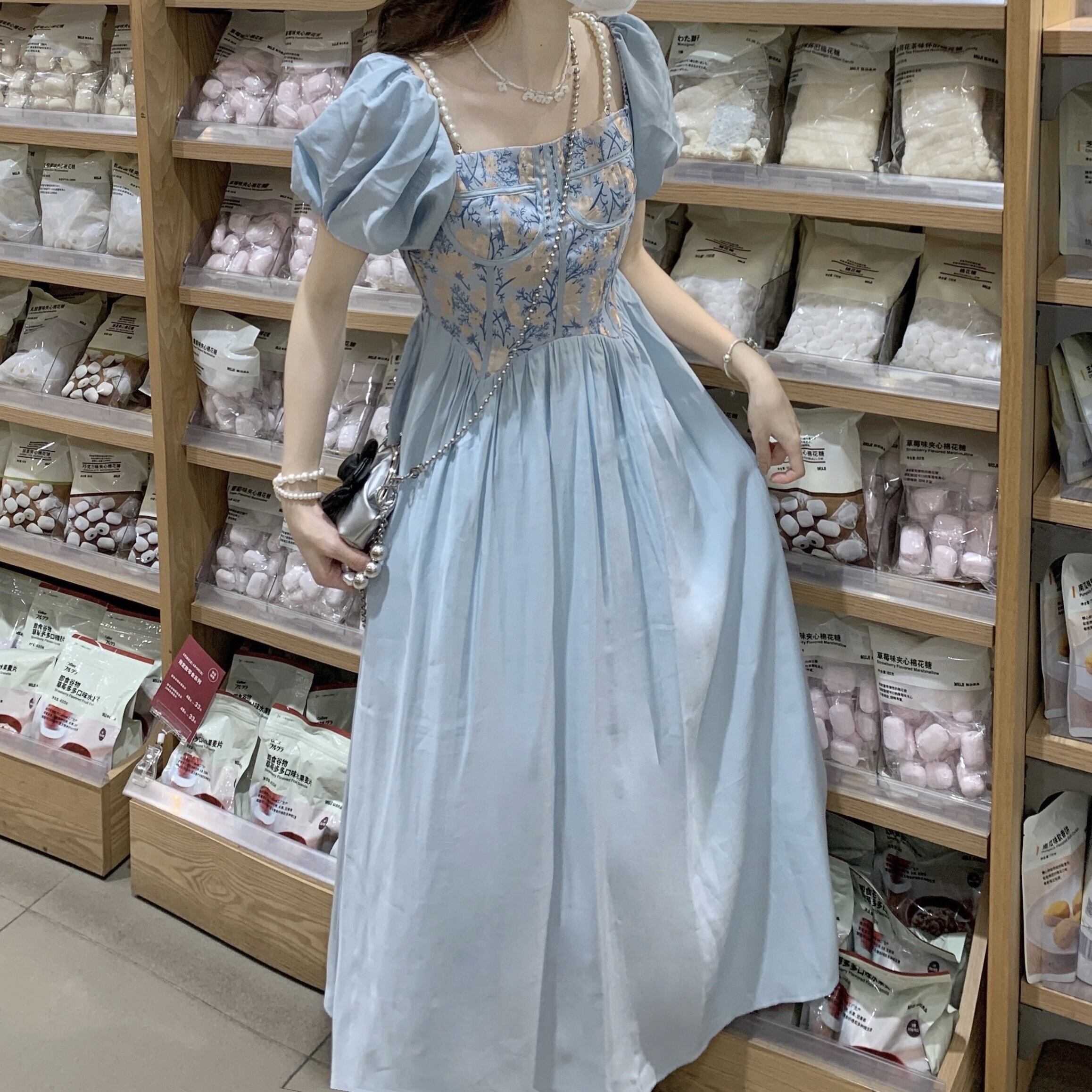ドレス ワンピースドレス ロング丈スカート 肩出し 半袖 バルーンスリーブ スクエアカラー ジャカード パール サスペンダー ウエストステッチ プルオーバー ふんわり かわいい 大人可愛い きれいめ カジュアル 大人 上品 おしゃれ お洒落 レトロ 大人女子 こなれ感 ラブリー キュート ガーリー 個性的 セクシー エレガント モダン 主役級 存在感 花柄 春 夏 10代 20代 レディース 女性用 お出かけ パーティー イベント テーマパーク ハロウィン モテ ファッション S M L ライトブルー