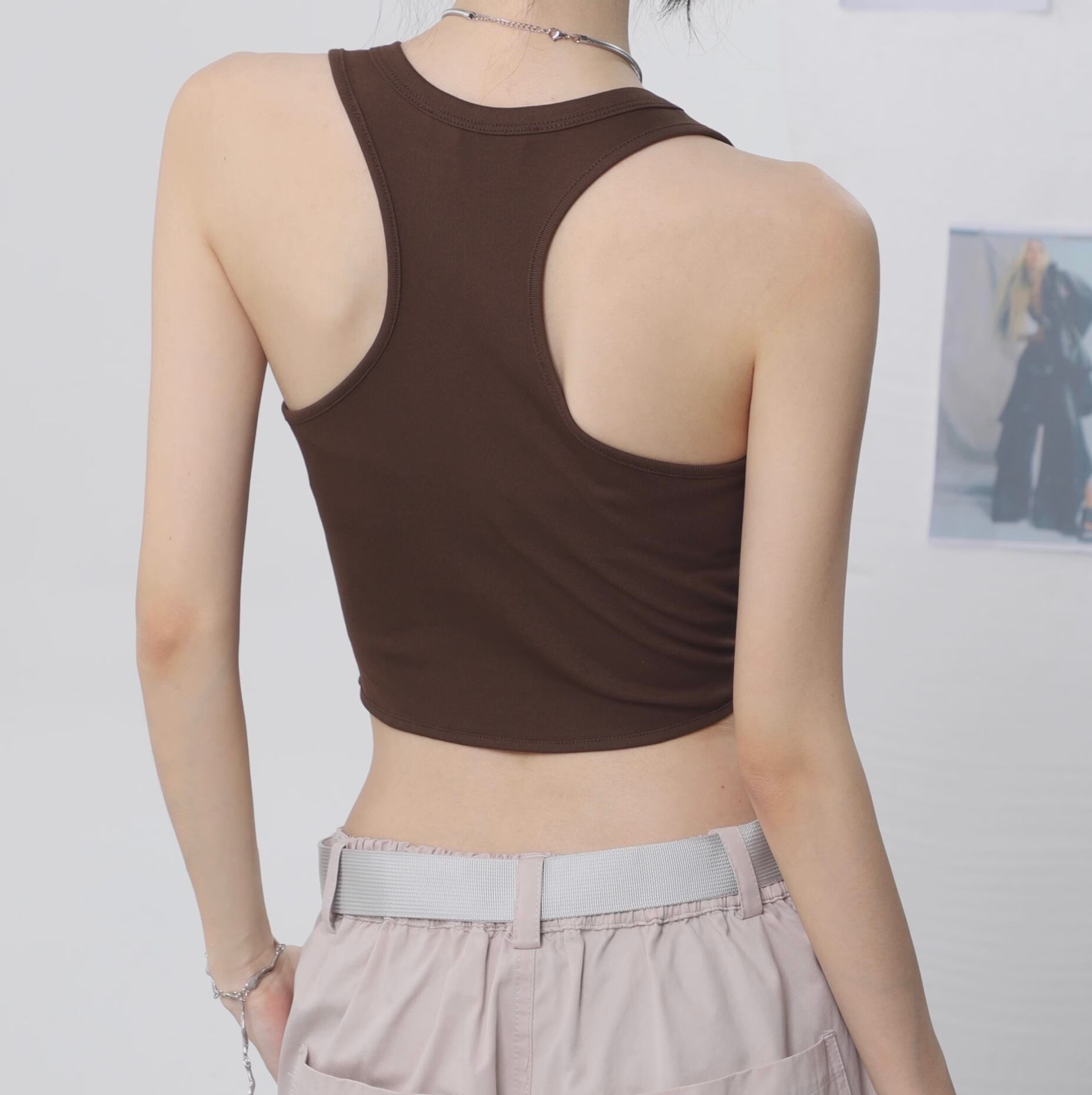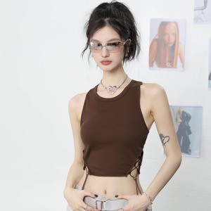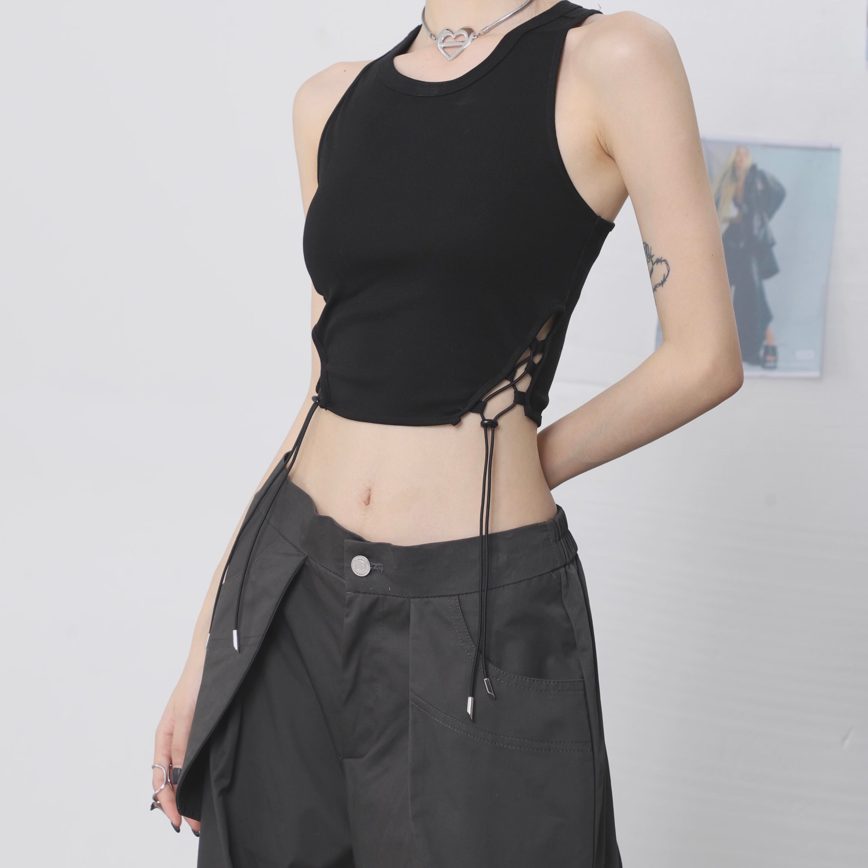 こなれ感溢れるノースリーブトップスと、パンツのベルトがアクセント。