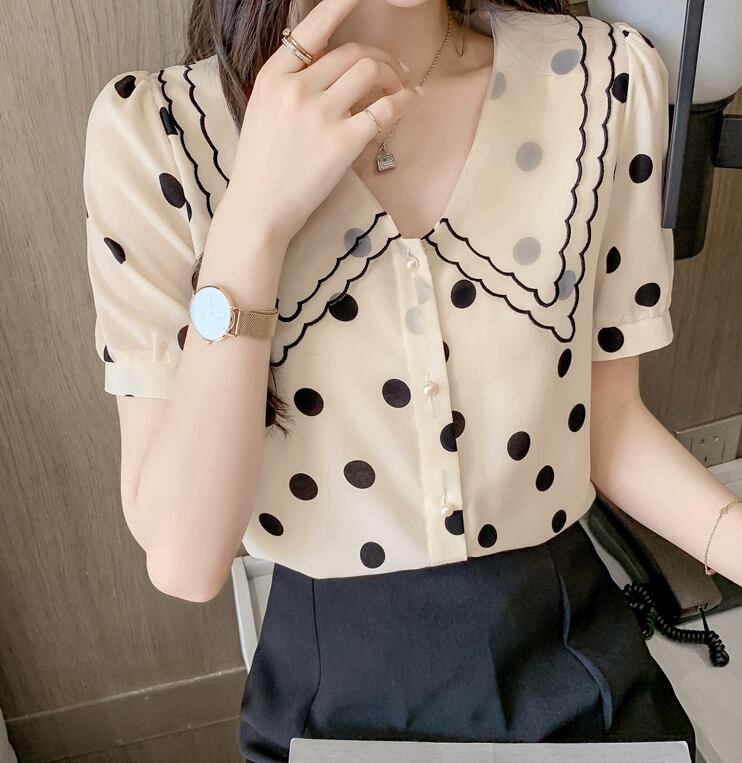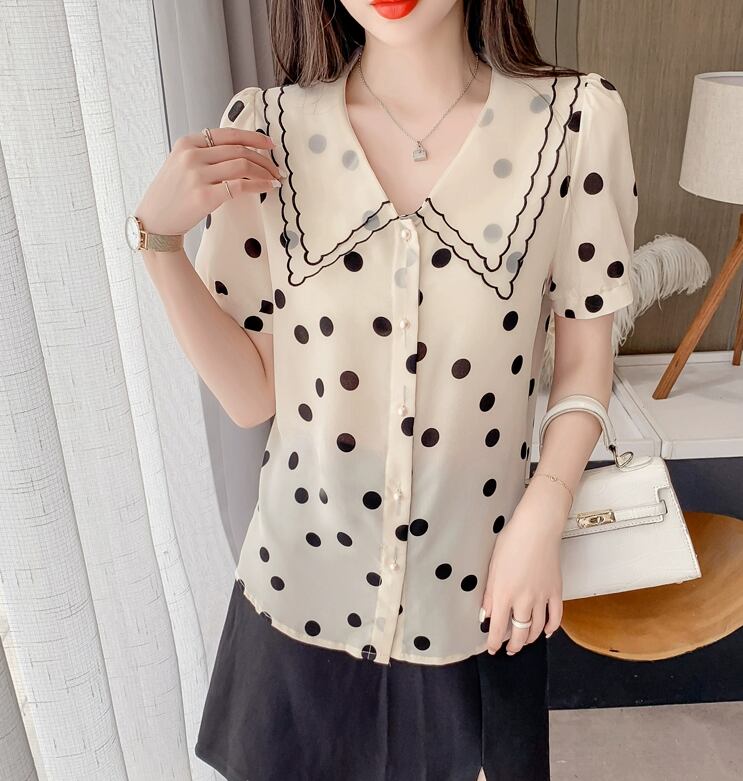 ドット柄ブラウス アプリコット トップス シャツ ブラウス 袖あり 半袖 襟付き もこもこ 前開き パール お得 かわいい おしゃれ お洒落 レトロ 清楚 ラブリー キュート ガーリー 存在感 柄 ドット柄 水玉 春 夏 秋 ロングシーズン 10代 20代 30代 レディース 女性用 学生 デート お出かけ 女子会 レストラン お呼ばれ お茶会 ランチ ショッピング 休日 着回し 普段使い オルチャン 韓国系 モテ プチプラ インスタ映え S M L XL 2XL 小さいサイズ 大きいサイズ