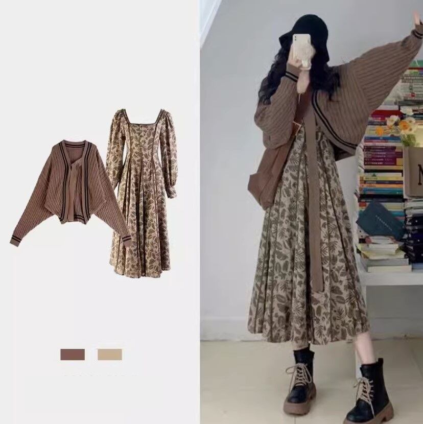 レディース ワンピース カーディガン 2点セット 上着 フレア 羽織 前開き フレアスカート ロングスカート ロング 長袖 ドルマンスリーブ スクエアネック 襟なし フレア Aライン フェミニン かわいい おしゃれ レトロ キュート 花柄 総柄 秋 冬 通勤 通学 デート お出かけ 公園 休日 ブラウン