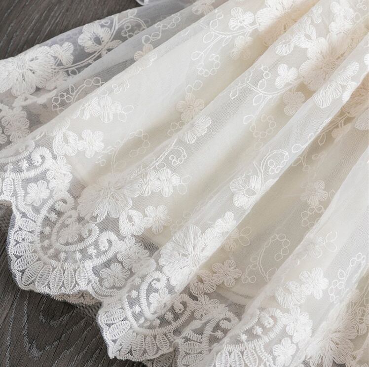 花柄の刺繍が施されたレースワンピースに、チュールスカートとスカラップデザインが女の子らしさを引き立てています。