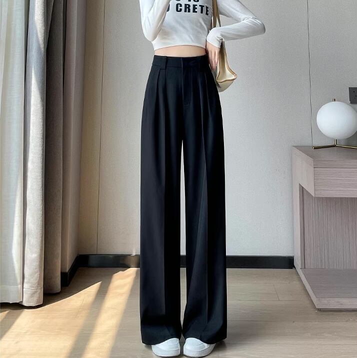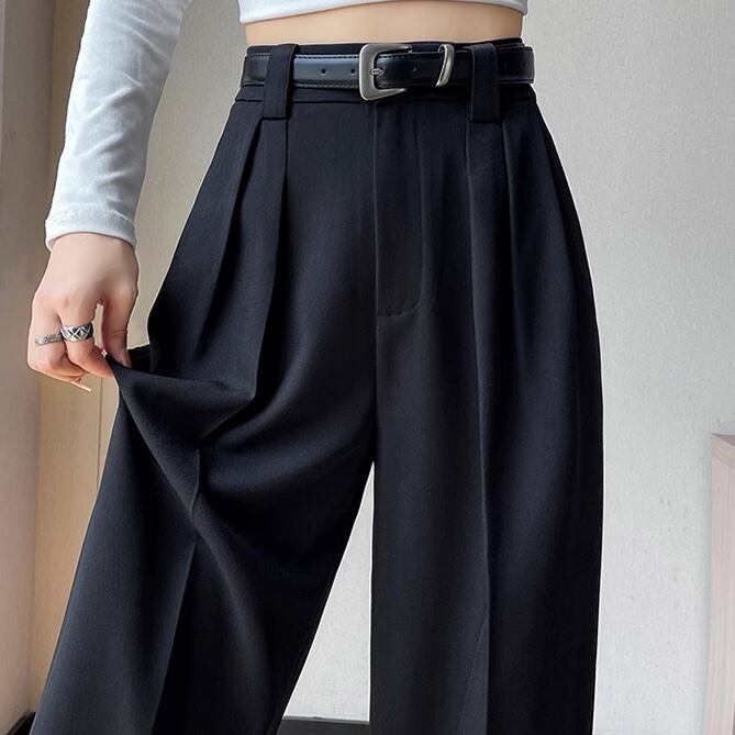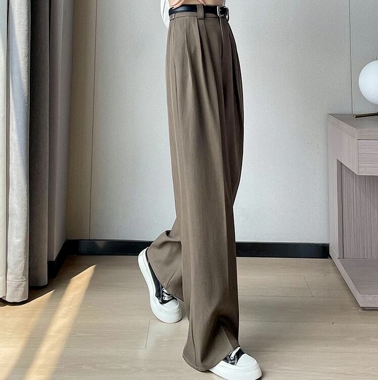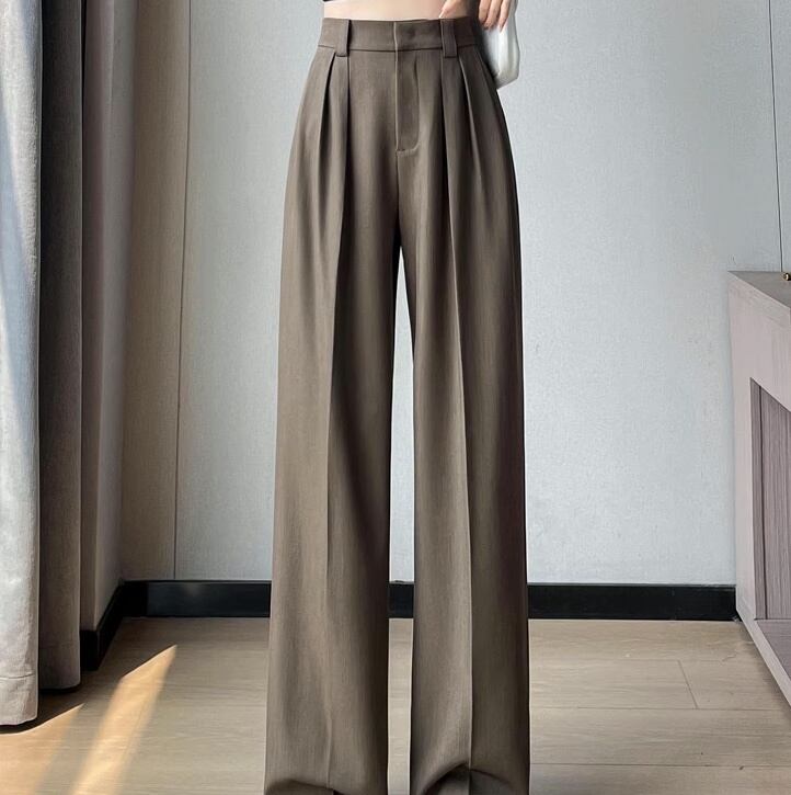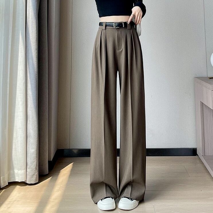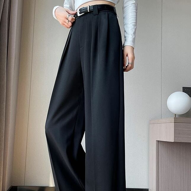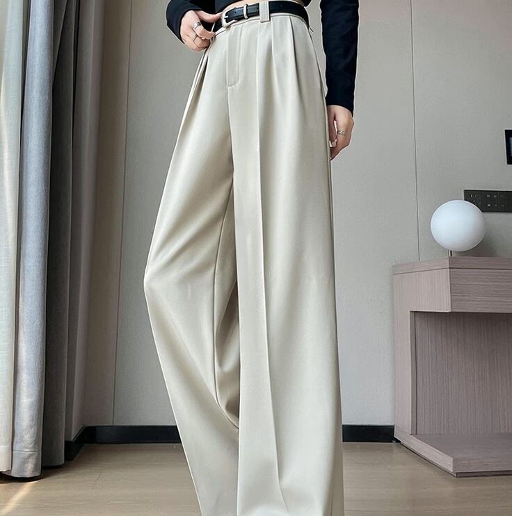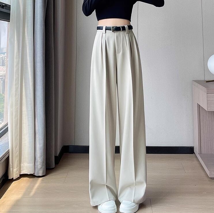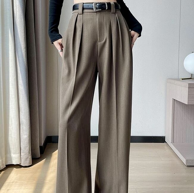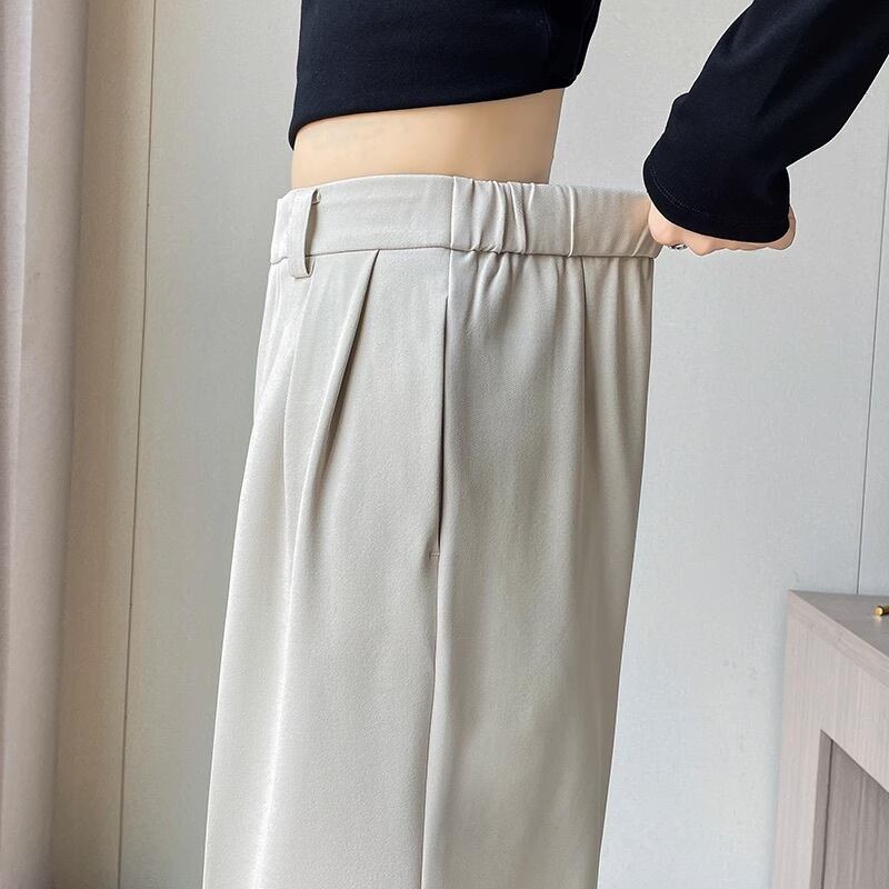 シンプルで上品なストレートパンツ、ハイウエストとウエストゴムで快適な着心地。