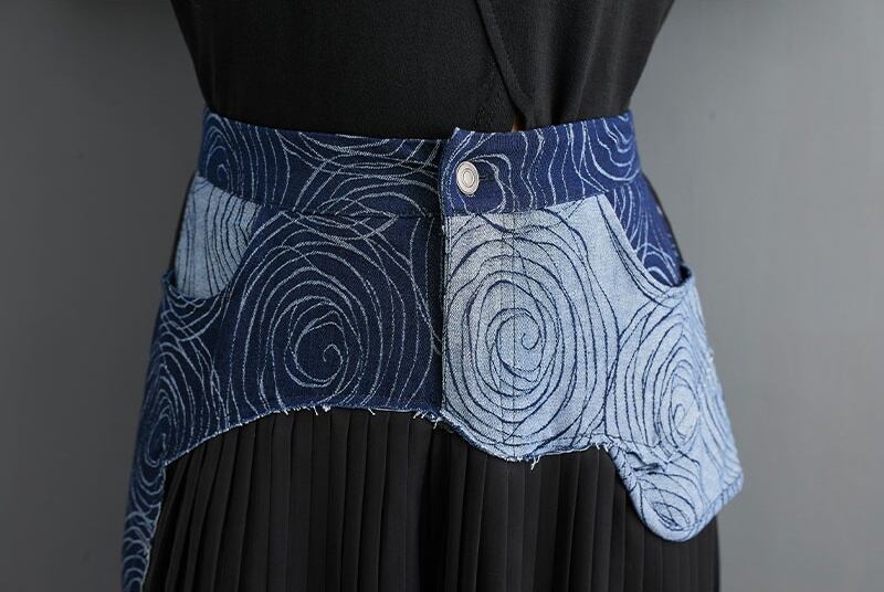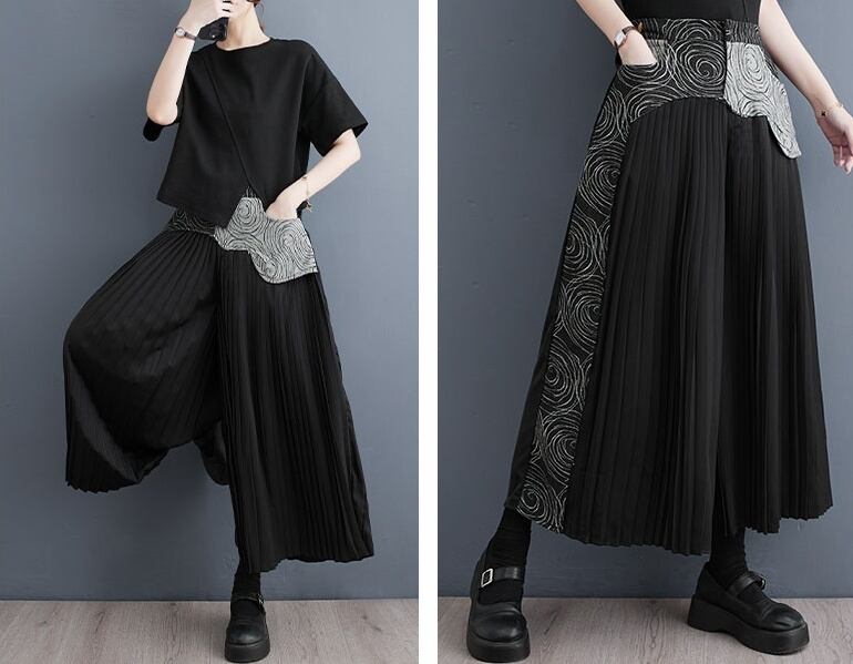 ウエストからサイドにかけて和風柄を取り入れた古風な雰囲気が特徴で、個性的なプリーツガウチョパンツ。