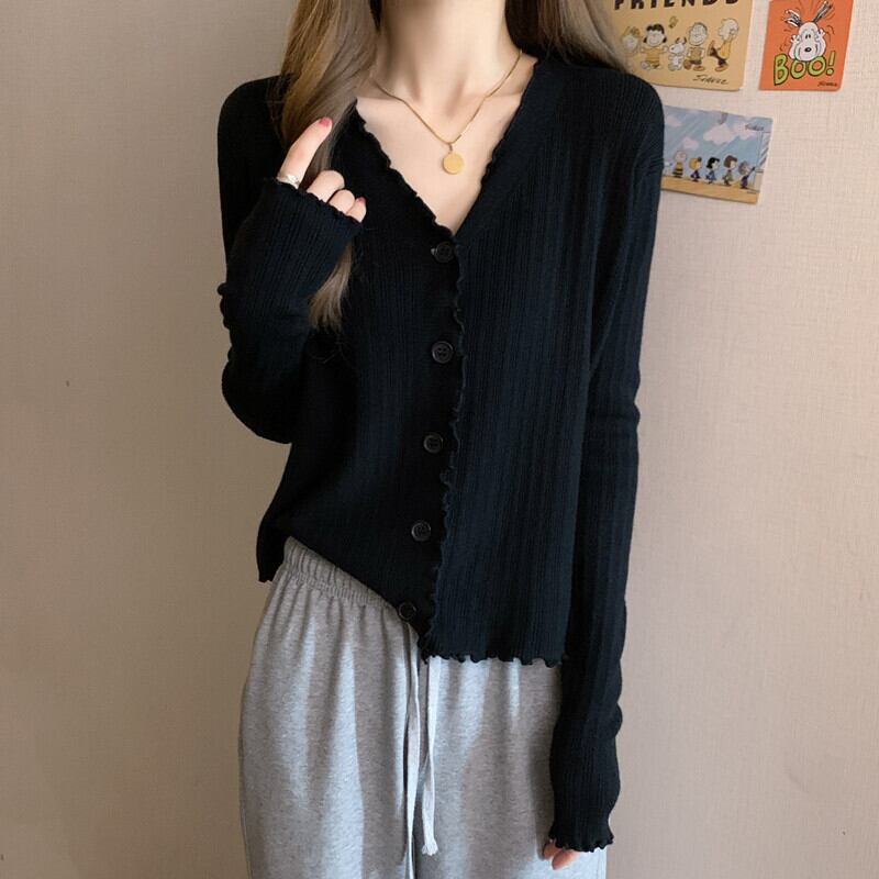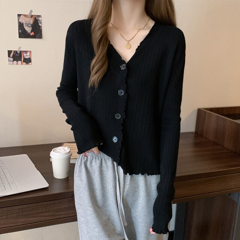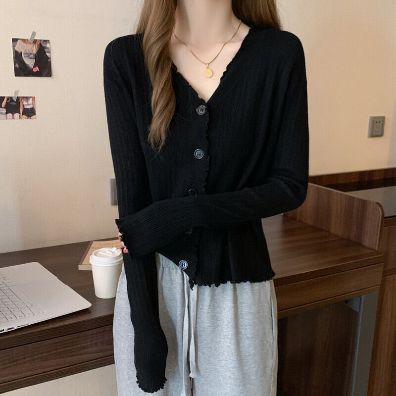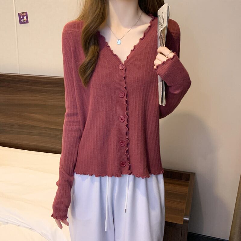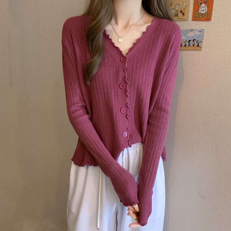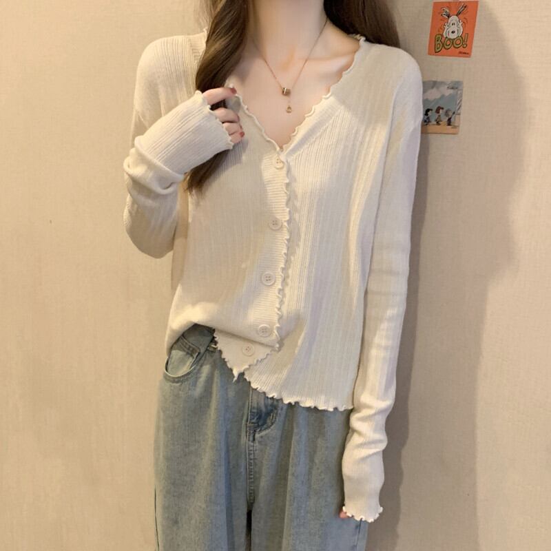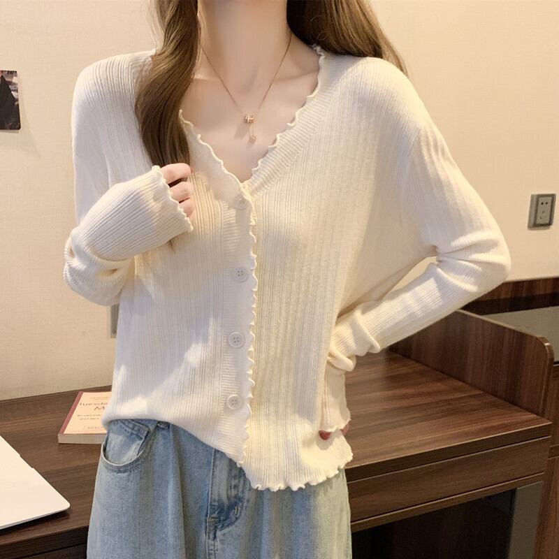 Vネックと前開きのデザインで、女性らしい華奢な印象を与えます。
