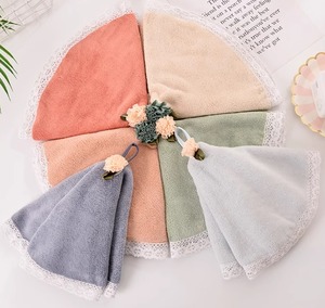 フラワーモチーフの付いた吊り下げループにレースの縁取りが特徴的な丸型タオルで、可愛らしいインテリアにピッタリです。